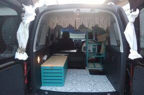 Die umgeklappten Rücksitze würde den oberen Teil des "BETTES" bilden (mit einem 80x80 cm mittig geklappten Brett darauf) und daneben würde ein vorhandenes REGAL mit drei Schubladen Platz für das KÜHLFACH und je einem Teil für die Jungs als WÄSCHEFACH bieten. Darauf wollte ich den FRISCHWASSERTANK stellen, um die Schwerkraft zu nutzen, so dass ich keine extra Wasserpumpe benötigen würde.