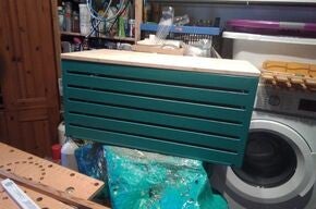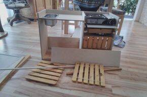 Dann ging es an die "Möbel". Geplant war meine alte Kombüsenkiste vom Boot als SITZBANK / STAURAUM zu nutzen. In der Nacht würde sie die eine Seite des Fussteils des Bettes ausmachen. Gegenüber wollte ich eine Mini- Küchenzeile mit Brenner, Waschbecken, Abwassertank und Stauraum bauen. Zwischen Küche und Sitzbox sollte ein Brett eingepasst werden, das bei Tag einen Tisch und in der Nacht die zweite Seite des Bett-Fussteils ausmachen würde.