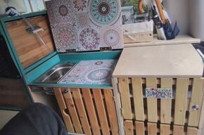 Die Sitzbox und das Regal waren ja bereits fertig. Die Box bekam noch einen Deckel, das Regal schicke Griffe und beides einen Anstrich in sattem Petrol (nicht, dass ich mich von den anderen Vanlifern noch unterscheiden würde!! Das geht ja so gar nicht ) Dann ging es an den Küchenblock. ich plante, zeichnete, verwarf und begann von Neuem. Endlich hatte ich einen halbwegs brauchbaren Entwurf. Das war ja schließlich mein allererster Camperausbau. Was wusste ich schon...