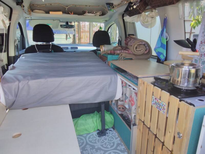 NACHTRAG: Das hintere Teil der beiden Matratzenteile wurde deutlich verschmälert, um es gut versetzen zu können. (Ich baue ziemlich häufig zwischen Schlafen und innen Kochen (wie mittiges Bild oben) um. Da sollte sich das hintere Teil gut handeln lassen)