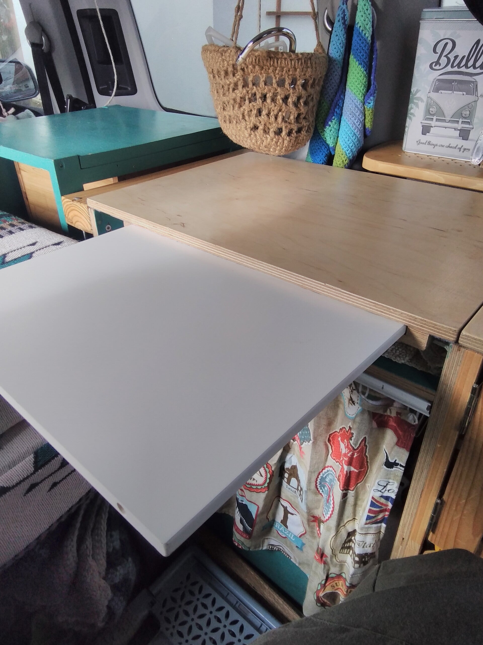 Ich brauche immer mal wieder unter Tags Wasser (Hände abwaschen, Trinken). Der "Aufbau" des Wasserhahns an der Spüle ist dazu zu umständlich und meistens habe ich da noch mein Bett aufgebaut, was nicht versehentlich nass werden soll. Also habe ich mir ein kleines, etwas abenteuerliches Wassersystem gebastelt. Es hängt normalerweise am Fressbrettchen, kann aber jederzeit an das Hecktischchen oder einer Türe am Küchenblock umgehängt werden. Die Pumpe ist eine USB ladbare Fasspumpe, der Wasservorrat dafür ein 5l Wassersack, der in einem länglichen Körbchen im unteren Fach des Küchenblocks ist. Den Deckel davon habe ich durchbohrt um den Schlauch durchführen zu können (Deckel unbedingt nach oben, da er nicht mehr dicht ist, oder man macht ihn mit Silikon etc. dicht.)