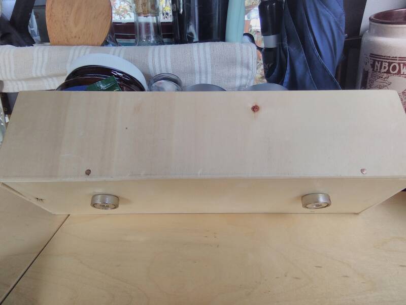 Die "Bulli-Box" beinhaltet Heisse Tasse- Beutel, Tees, ... Trockenes Zeugs, Süsskram. Sie hält ebenfalls mit einem Magnetband (das dunkle unten) und zusätzlich mit einer Zwinge, mit der ich auch die Klappe vom Gasbrenner an das Holzkistchen gezwickt hochhalten kann, da die bei nicht ganz waagrecht stehendem Caddy droht nach unten zu fallen (und damit auf den Topf, was natürlich blöd ist).